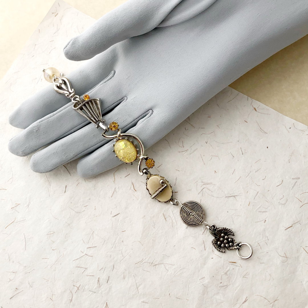 This bracelet features two repurposed mid-century necklace links and bracelet link, repurposed screw-back earring, Japanese-made lustre glass bead, a repurposed bracelet link and bead.