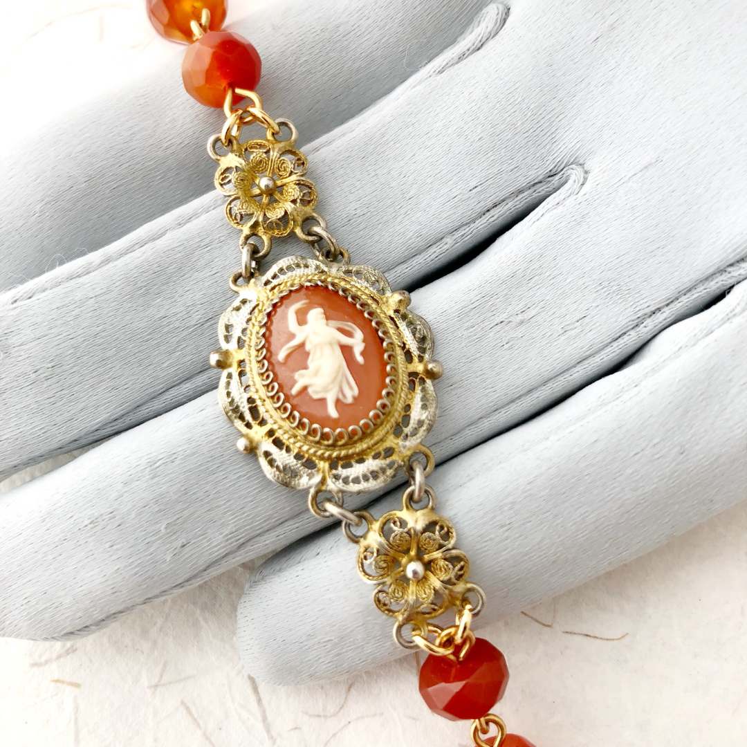 This elegant bracelet features a repurposed filigree silver necklace link set with a carved shell cameo. The centre medallion in the original necklace is marked “800” indicating that it is made from European silver. Based on the intricate filigree design I suspect that it was a souvenir necklace purchased in Italy, long renowned for cameo carving. I’ve matched it with facetted semi-precious Carnelian rondelles.