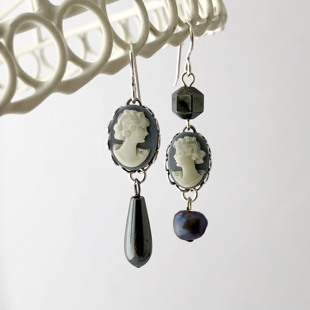 These asymmetrical earrings feature blue resin cameos that I sourced in a vintage warehouse while travelling in the USA some years ago. I've combined them with a new Hematite drop, a repurposed Hematite bead, and a lovely freshwater pearl in matching tones.