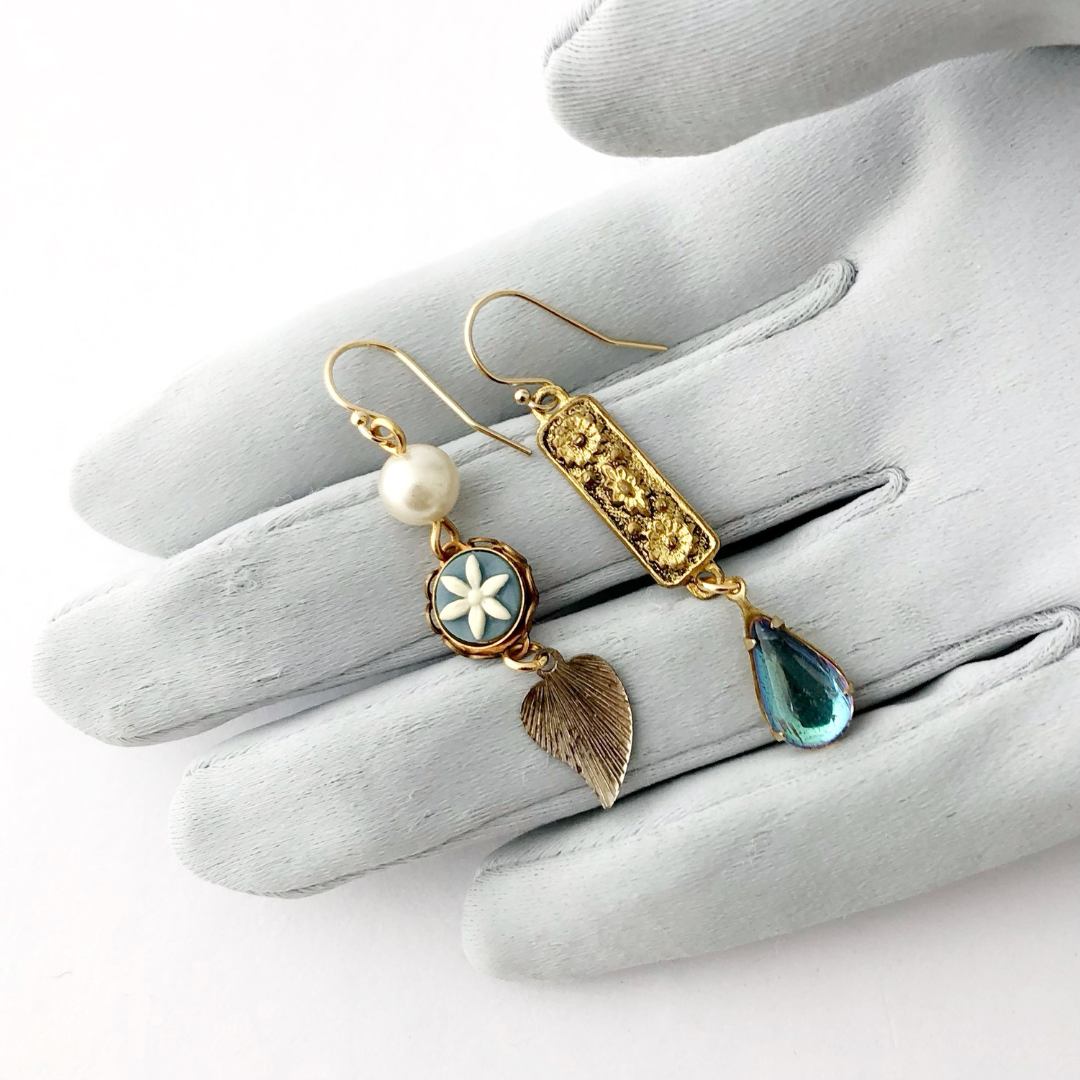 These asymmetric earrings feature repurposed vintage materials including a small blue cameo flower, a floral themed connector from a 1930s brooch, a mid-century pear-shaped rhinestone in new brass setting, a leaf charm repurposed from a clip-back earring c.1960s and a vintage bead.