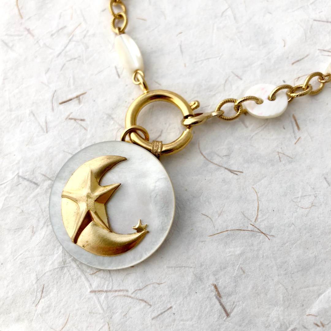 This elegant necklace is designed to close at the front. It features an antique mother-of-pearl brooch which I’ve embellished with a vintage brass stamping of a crescent moon. I have created a chain with repurposed vintage mother-of-pearl buttons and beads connected with gold-plated chain links. I think that the gentle, reflective quality of the mother-of-pearl evokes an image of moonlight dancing on water.
